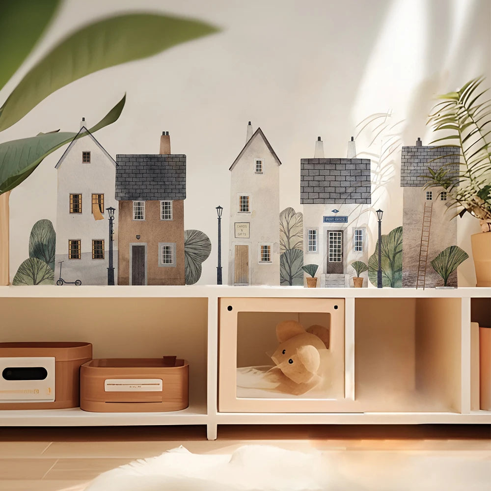 Add a touch of whimsical charm to your child's space with this Large Watercolor Building Wall Mural. Made from soft, high-quality fabric material, this peel-and-stick decal is easy to apply, removable, and repositionable—perfect for nurseries, playrooms, and creative corners.