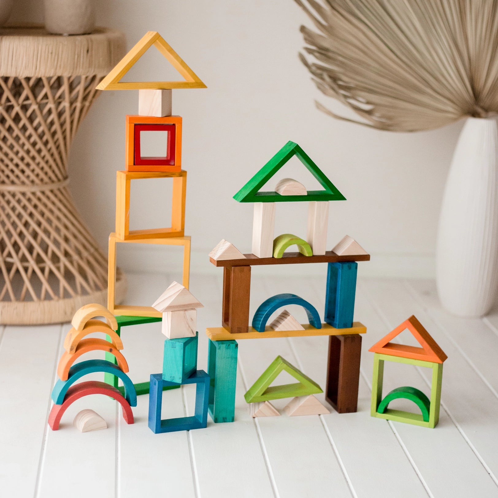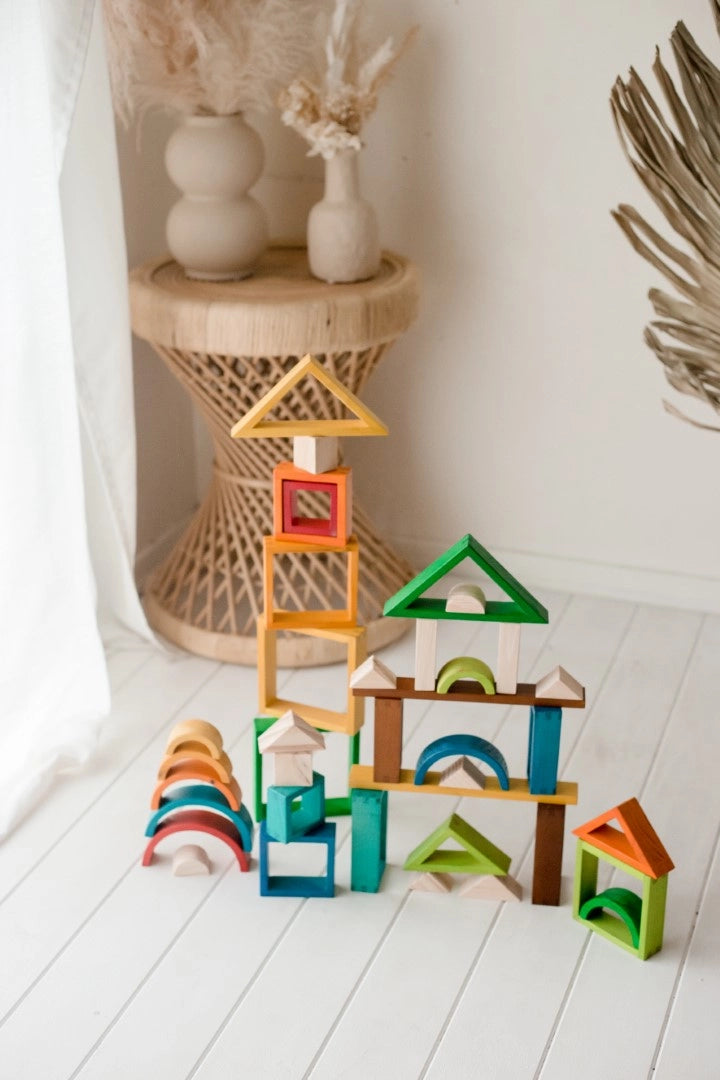 A perfect, well-rounded all-in-one building set for children. Contains hollow blocks in various shapes and beautiful colours. Great for sorting, nesting and building activities with unlimited potential. Made from plantation timber and non-toxic paints making them 100% safe and good for the earth too!