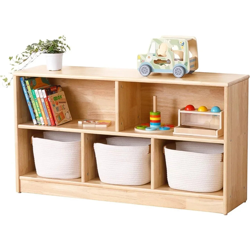 Large Storage Capacity: This Montessori-style wooden shelf includes five open compartments in two different sizes, perfect for storing children's books, toys, school supplies, and storage bins. The flat top surface adds extra space for display or everyday items. A matching corner unit is available separately for those looking to expand their storage setup. Thoughtfully designed at a child-friendly height, this shelf helps keep spaces neat and encourages kids to develop independent tidying habits.